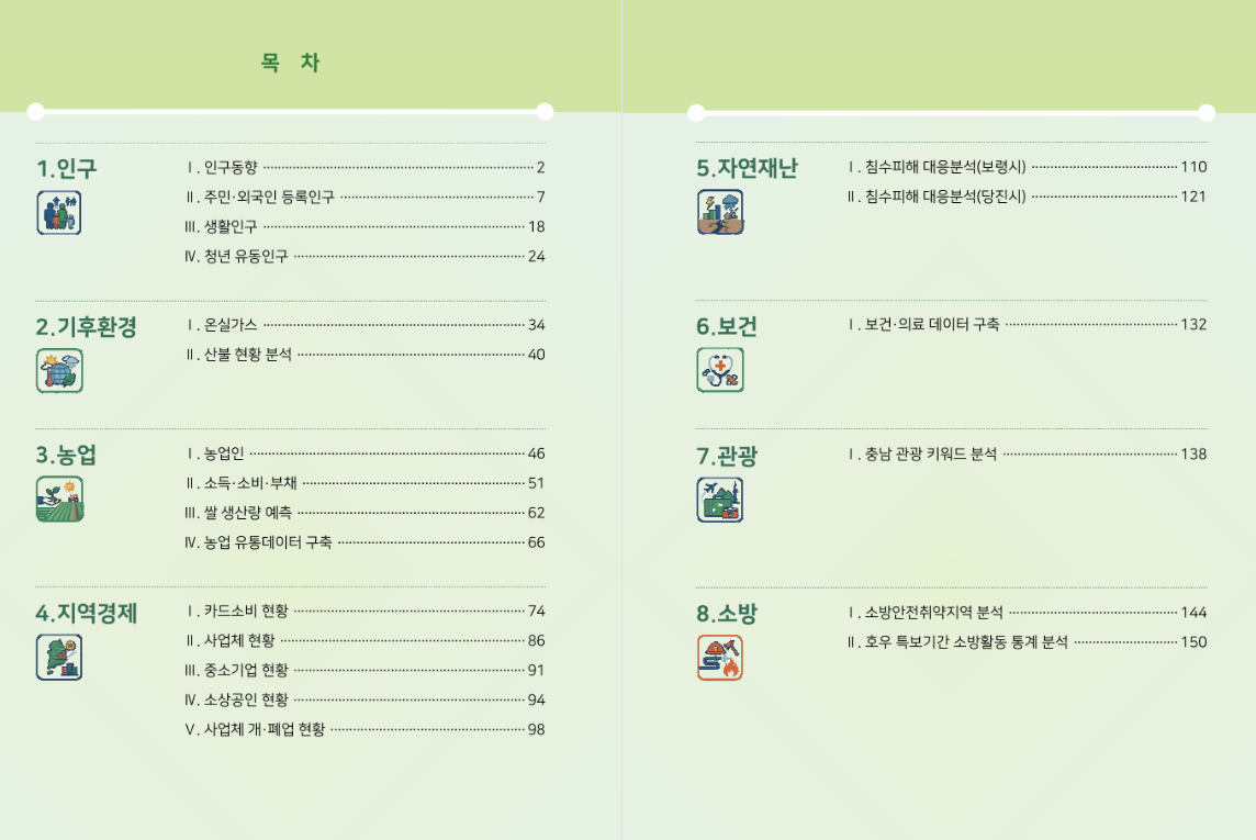 ○ (주요내용) 민간·공공 빅데이터를 활용한 인구·기후환경·농업·지역경제·자연재난*·보건·관광·소방 등 8개 분야 21개 분석 사례집 발간